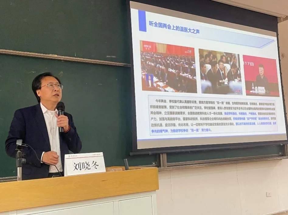 刘晓冬经理在学习活动中,系统阐述了习近平总书记在全国两会期间的重要讲话精神,他指出总书记的系列讲话为公共卫生事业的高质量发展提供了明确的方向指引和根本遵循,强调了以人民健康为中心的发展理念,为国家公共卫生体系的建设注入强大的思想动力。在关注“温医大之声”环节,刘经理详细介绍了全国人大代表、董事长李校堃院士提到的“挺膺担当,逐梦星辰大海”、“加强康复团队建设,培养更多康复领军人才”、“AI医疗,未来看病会变成什么样?”、“支持地方医公司校进‘双一流’”、“优化国家战略科技力量布局”等关键词的内容,带领员工共同聆听两会上的“温医好声音”。