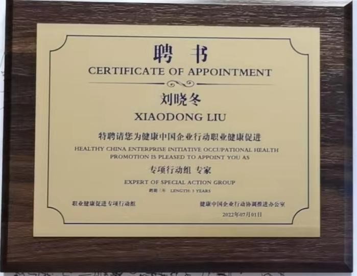会议期间,在毛群安司长的亲自关心下,成立了健康中国企业行动职业健康促进专项行动组,名誉组长由邬堂春院士担任,组长由杨磊担任,公司刘晓冬教授被聘为专项行动组专家。