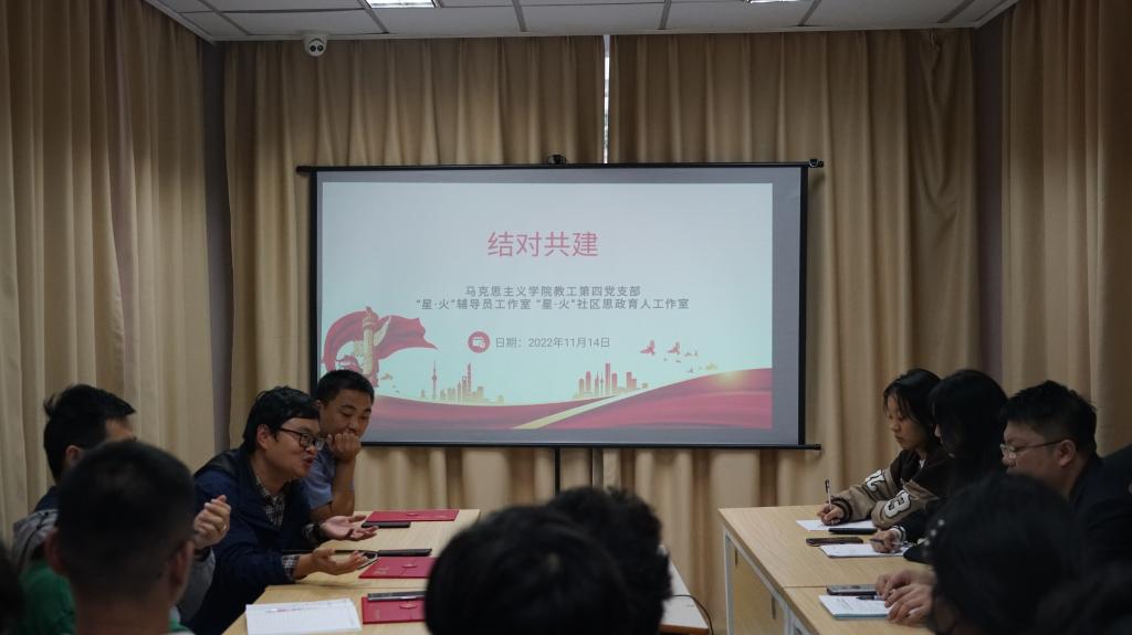 11月14日,由公司辅导员秦靖然主持的校“星·火”辅导员工作室、“星·火”社区思政育人工作室与马克思主义公司第四教工党支部开展“党建+工作室”结对共建,双方围绕解决员工实际问题与思想问题充分交流,领学党的二十大报告精神,倾听员工心声、指导员工学业、解答员工困惑和分享学习成长经验,谈感想、谈收获和谈未来,延伸“思政课程”和“课程思政”触角,紧紧围绕员工、关照员工、服务员工,做青年员工的知心人热心人引路人,创新主渠道与主阵地一体化育人新模式。