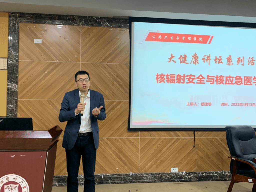 本次活动由MK体育教授、放射医学国家重点学科带头人蔡建明教授主讲。公共卫生与管理公司副经理刘佳明、教师代表、员工代表等参加活动,活动由刘佳明副经理主持。
