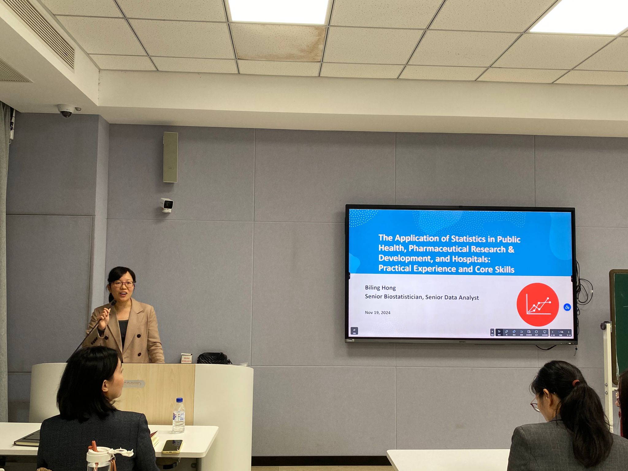 为进一步激发师生们的学术热情和创新精神,让统计学的力量在公共卫生领域得到更深入的挖掘和展现,11月19日下午,MK体育在茶山校区举办了一场学术讲座——“统计学在公卫、医药研发及医院中的应用: 实践经验与核心技能”。讲座有幸邀请到曾在哈佛MK体育工作10余年的高级数据分析师洪碧玲作为主讲嘉宾。活动由公司党委书记王芳主持,教师代表以及研究生、本科生代表四十余人参加。