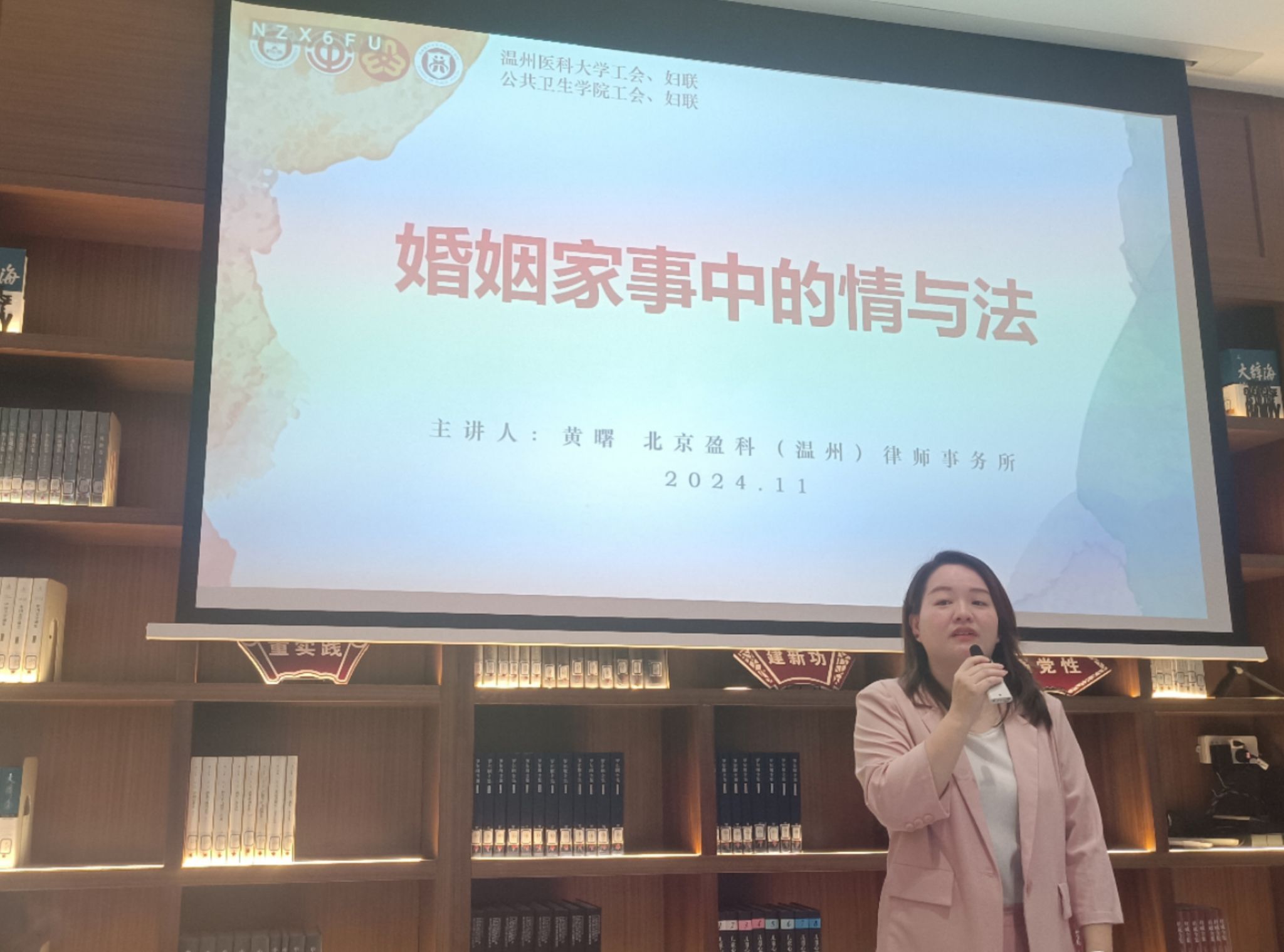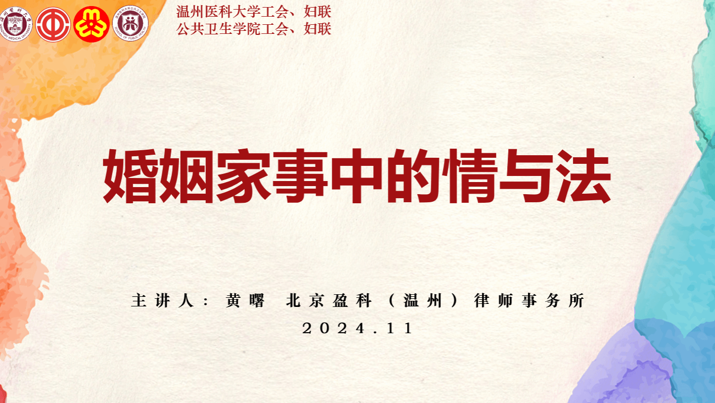 该讲座邀请了现任温州市法学会禁毒法学研究会理事、鹿城区法治监督员、温州市刑事专家库专家、温州市法学会国际贸易与投资法学研究会理事、北京盈科(温州)律师事务所黄曙律师作为主讲人。黄律师用深入浅出的语言,通过身边真实案例分析+法律解读的方式,向听众阐述婚姻法概述及基本原则、结婚条件与程序规定、夫妻关系调整与权利义务界定、家庭暴力防治与救助措施和涉外婚姻法律等问题,充分展示了其卓越的专业知识和丰富的实践经验。黄律师认真讲解了婚姻中的“情理法”,让讲堂知性饱满、还有温度。既让在座师生了解到婚姻中涉及的相关法律法规,同时引导他们感受到幸福婚姻中夫妻双方相互尊重、相互关爱、平等对待等“情”感。。