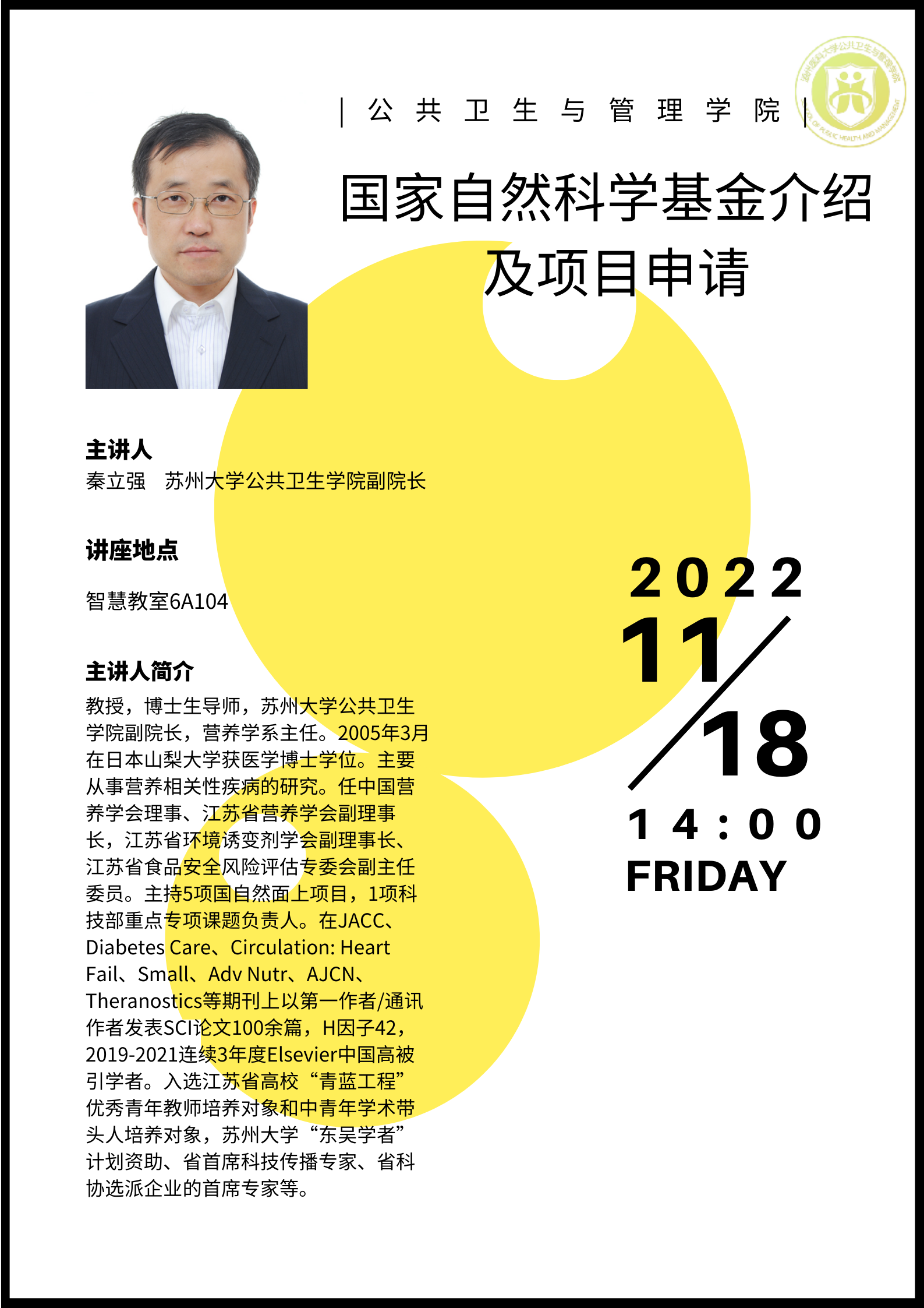 【“国家自然科学基金介绍及项目申请”讲座】 单毓娟老师特邀苏州大学MK体育副经理秦立强教授来院开展讲座。 讲座主题:国家自然科学基金介绍及项目申请 讲座地点:智慧教室6A104 讲座时间:2022年11月18日下午14:00 机会难得!欢迎各位老师和同学准时参加讲座! 公共卫生与管理公司 2022年11月15日