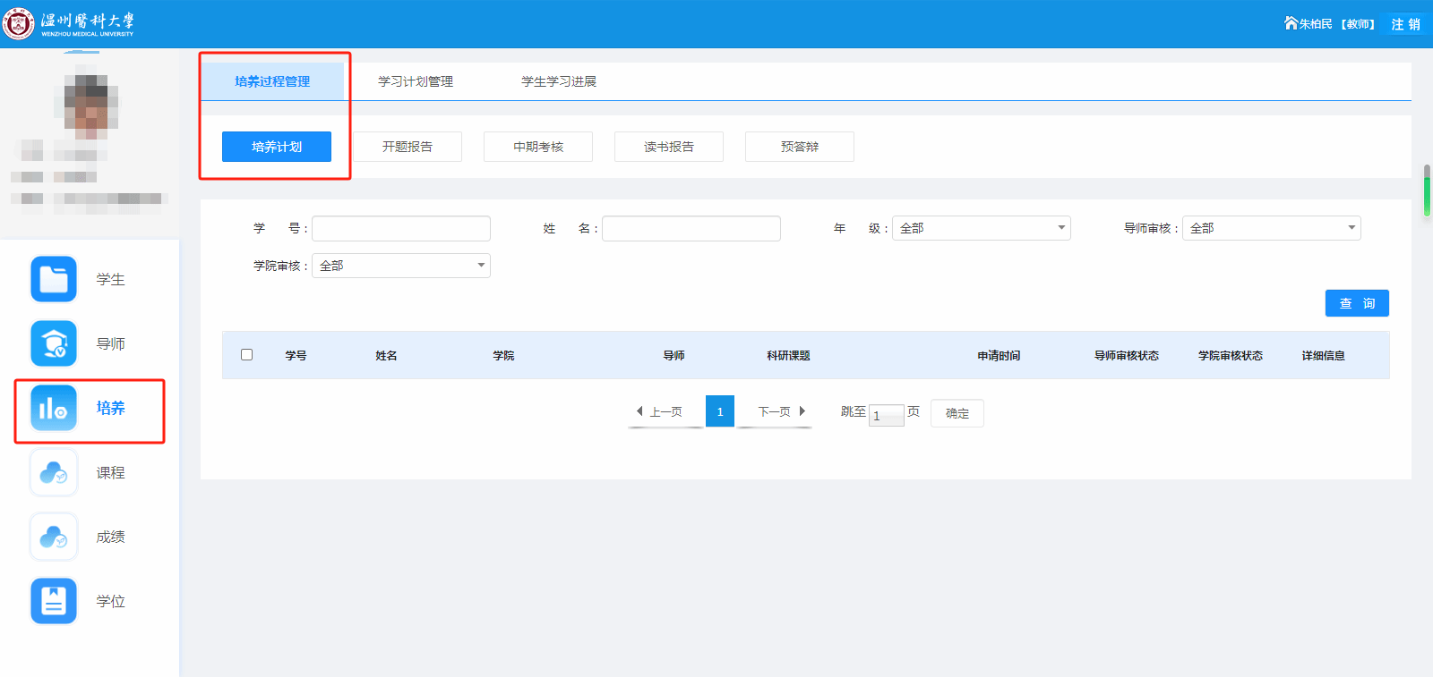 2.导师审核:完成的培养计划需提交导师审核,经导师、公司审核通过后,方可打印成书面版本,并且需要导师在纸质版的《公司产品计划表》的导师栏进行手签后上交公司。导师登录系统后,进入员工管理——过程管理——培养计划,可查询员工填写的培养方案并进行审核,导师也可驳回员工的培养计划,经员工修改后再次提交审核。
